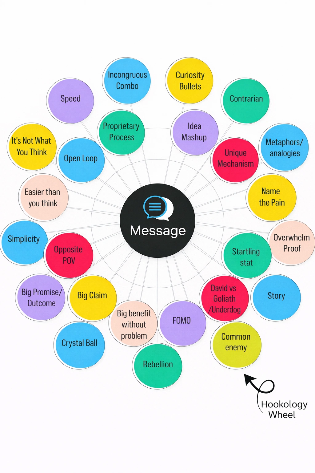 Instead of guessing which angle might work, the Hookology Wheel gives you a map of strategic options so you can choose the right hook for the moment, the market, and the medium.
